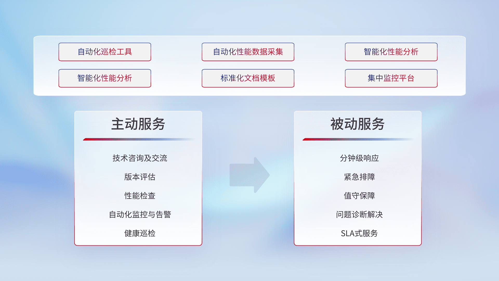 智能化工具和标准化文档,,保障服务质量,,提供主动服务(包含技术咨询、、版本评估、、、性能检查、、自动化监控与告警、、健康巡检)和被动服务包含(分钟级响应、、、紧急排障、、、值守保障、、、问题诊断解决、、、、SLA服务)。。。。
